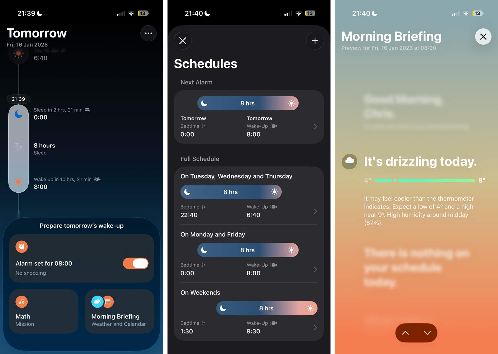 There are three main parts of the app: your schedule, missions, and morning briefing.